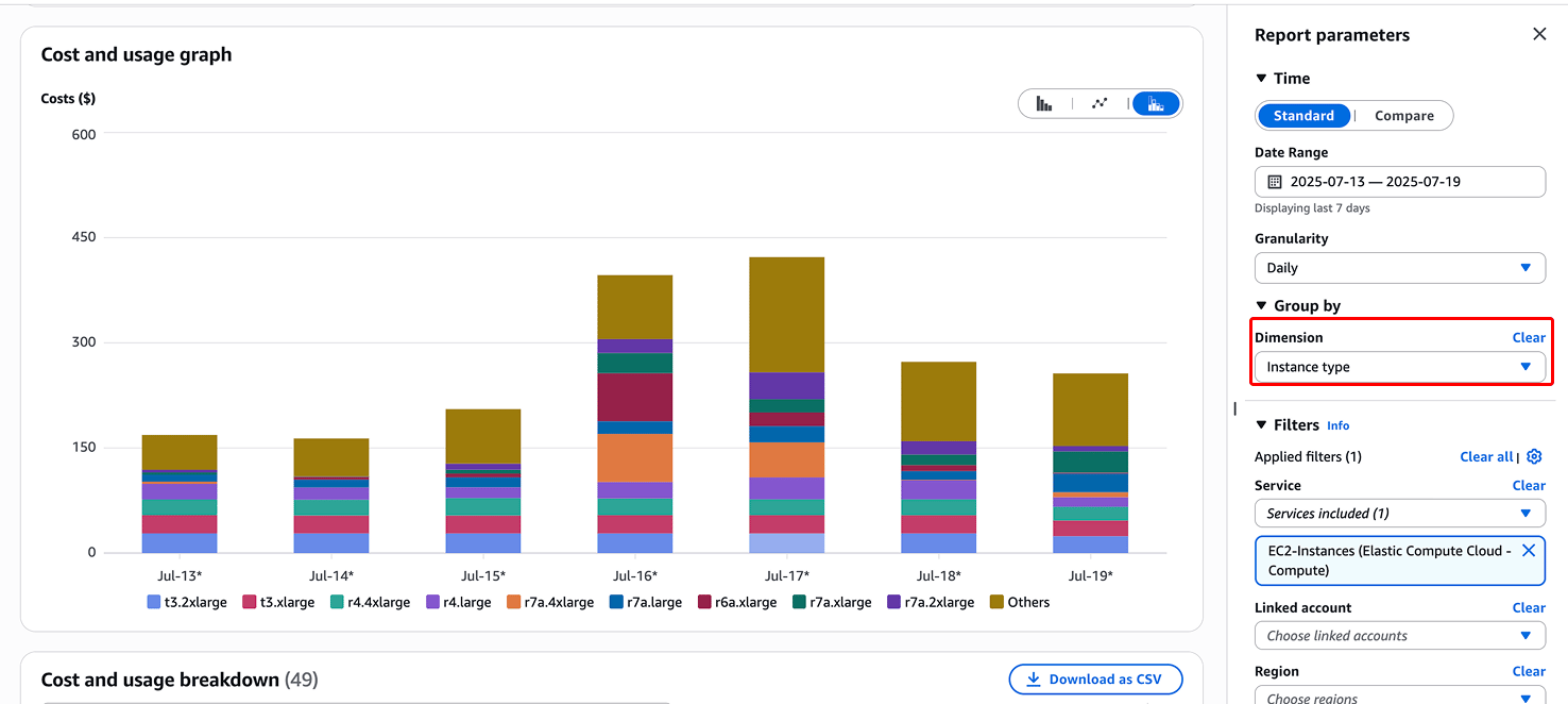 Next, you’ll once to split up the spend by instance type, which can be seen here.