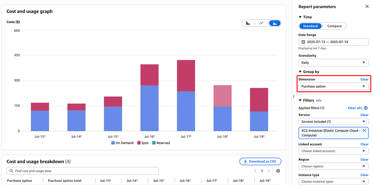 So when you see on AWS Cost Explorer that you are [usually] paying $150 per day on EC2. It’s super critical to figure out where the $150 is going. One other place you should look is to understand the split between On Demand, Reserved and Spot.